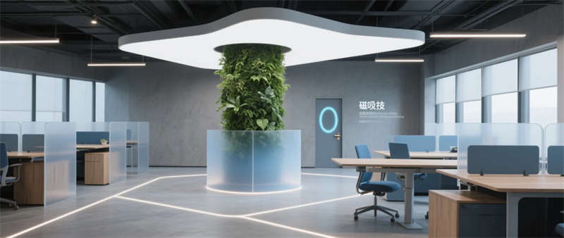 本項目以“未來生態(tài)辦公”為核心理念,打造1200㎡科技與自然交融的創(chuàng)新型辦公空間。設(shè)計采用啞光太空灰為主基調(diào),通過霧霾藍(lán)企業(yè)色與原木紋理的碰撞,在冷峻科技感中注入人文溫度??臻g以微水泥地面為基底,貫穿透光亞克力與陽極氧化鋁材質(zhì),配合隱藏式線性燈帶的流動光影,構(gòu)建出具有呼吸感的數(shù)字美學(xué)場域。