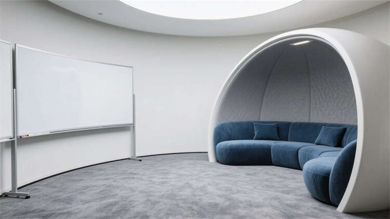 核心區(qū)域聚焦功能與美學(xué)的平衡:前臺(tái)木格柵墻以線性燈光延展空間縱深感;開(kāi)放式工位區(qū)通過(guò)綠植與幾何畫(huà)作注入生機(jī);獨(dú)立辦公室運(yùn)用胡桃木與皮質(zhì)元素提升質(zhì)感,整墻書(shū)架成為智慧沉淀的象征。過(guò)渡空間被賦予多重價(jià)值——走廊生態(tài)墻引入自然呼吸,蛋形討論艙激發(fā)即興靈感,階梯圖書(shū)館則營(yíng)造沉思角落。