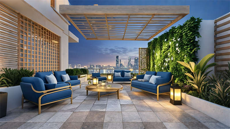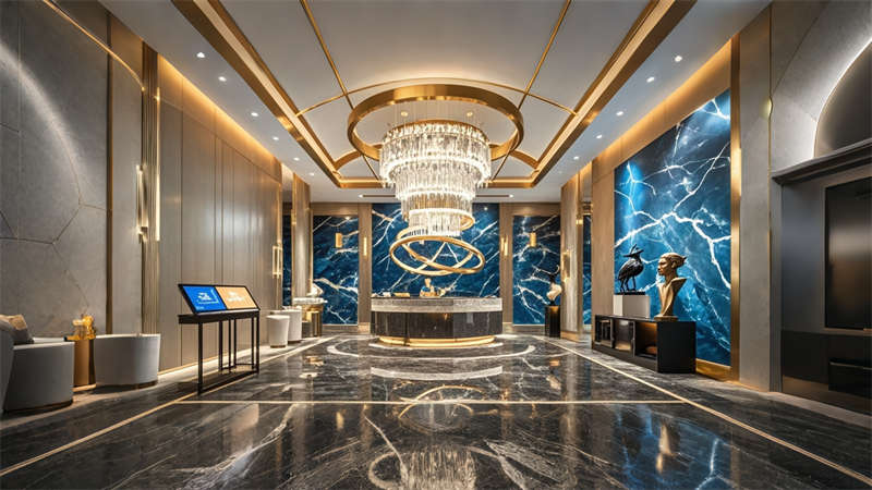 色彩體系以香檳金與深海藍(lán)為主調(diào),大堂采用香檳金金屬線條勾勒建筑肌理,搭配深海藍(lán)大理石營造視覺重心。客房區(qū)運用暖灰硬包墻面平衡色彩強(qiáng)度,通過2700K暖光與4000K中性光分區(qū)照明塑造晝夜場景。材質(zhì)組合注重層次:大理石地面、金屬構(gòu)件、絨布軟包形成質(zhì)感三部曲。