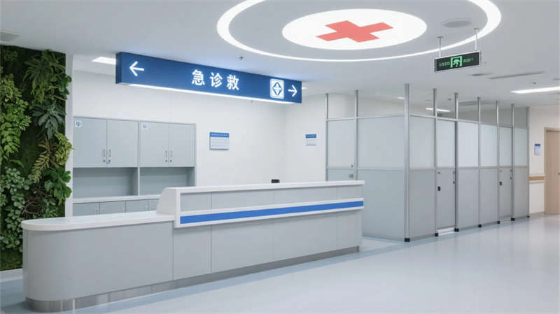 藥房區(qū)域的磨砂玻璃與金屬網(wǎng)隔斷,在通透與隱私間取得平衡;急診科模塊化設(shè)計(jì)確保高效響應(yīng),綠植墻緩解緊張情緒。全院統(tǒng)一運(yùn)用防菌地材、圓角處理及無(wú)障礙細(xì)節(jié),將安全關(guān)懷融入極簡(jiǎn)美學(xué)。
