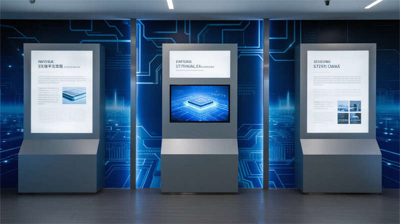 該半導(dǎo)體企業(yè)展廳以現(xiàn)代簡約風(fēng)格為核心,通過流暢空間布局與高科技元素,打造沉浸式科技體驗(yàn)。設(shè)計(jì)突出半導(dǎo)體技術(shù)的抽象表達(dá),利用藍(lán)色與灰色調(diào)營造冷靜、專業(yè)的氛圍,同時(shí)融入玻璃、金屬材質(zhì)增強(qiáng)通透感。入口區(qū)以懸浮雕塑引導(dǎo)視線,產(chǎn)品展示區(qū)通過簡約玻璃柜和觸屏互動,生動呈現(xiàn)技術(shù)精髓;技術(shù)創(chuàng)新墻以動態(tài)圖文展現(xiàn)工藝演進(jìn),歷史廊道則以線性敘事喚起行業(yè)記憶?;訁^(qū)和未來展望區(qū)強(qiáng)調(diào)參與性,采用環(huán)形屏幕與全息投影,讓訪客直觀感受創(chuàng)新應(yīng)用。休息區(qū)與演講區(qū)注重人性化,簡約家具結(jié)合微光紋理,提供舒適交流空間。整體設(shè)計(jì)摒棄繁復(fù)裝飾,以干凈線條和光影變化強(qiáng)化空間流動性,不僅傳遞半導(dǎo)體領(lǐng)域的精密與前瞻性,更通過美學(xué)融合提升教育性和觀賞性。展廳作為科技展示平臺,旨在激發(fā)探索興趣,體現(xiàn)企業(yè)對創(chuàng)新文化的重視。