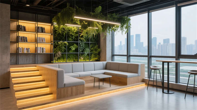 健康關(guān)懷融入細節(jié):減壓艙提供冥想庇護,屋頂花園集都市農(nóng)耕與星空社交于一體。實驗室的磁吸墻面與重組工作臺,呼應(yīng)著科創(chuàng)企業(yè)的迭代基因。整體設(shè)計通過原生材料與科技元素的碰撞,在工業(yè)質(zhì)感中生長出自然生命力,重新定義合肥現(xiàn)代辦公的可持續(xù)范式。