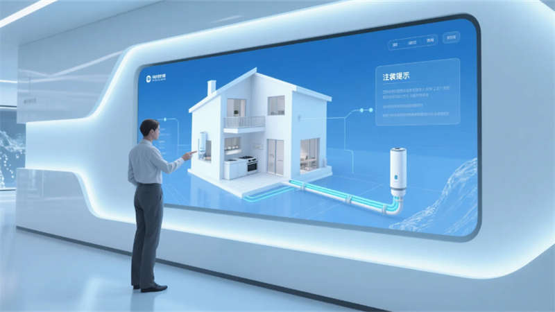 展廳以環(huán)形動(dòng)線串聯(lián)六大核心模塊:入口10米寬LED水幕墻動(dòng)態(tài)演繹凈水原理;中央懸浮式產(chǎn)品矩陣展臺(tái),通過全息投影拆解RO膜過濾技術(shù);實(shí)景化場景區(qū)1:1復(fù)刻家庭廚房、商務(wù)辦公樓及工業(yè)廠房,搭配交互式水質(zhì)監(jiān)測實(shí)驗(yàn)臺(tái);獨(dú)創(chuàng)的“虛擬管家”AR系統(tǒng),可生成個(gè)性化凈水方案并投射至合肥典型戶型模型。空間頂部采用參數(shù)化設(shè)計(jì)的波浪形燈網(wǎng),象征長江與淮河水系交匯,地面嵌入城市節(jié)水?dāng)?shù)據(jù)可視化地磚,凸顯本土環(huán)保責(zé)任感。